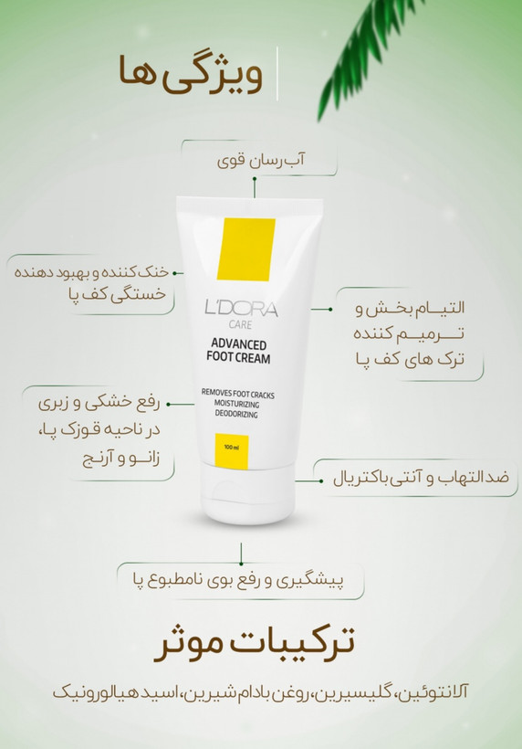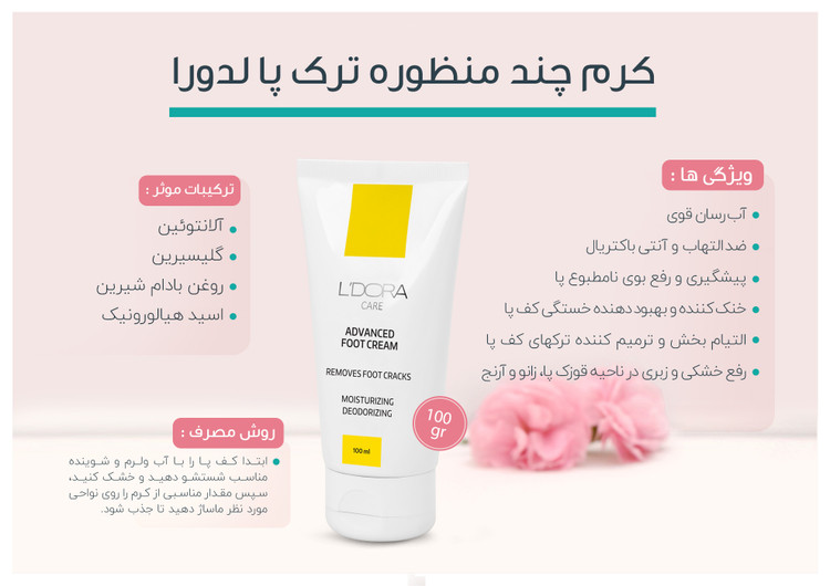 این محصول حرفهای یک ترمیمکننده مناسب برای کف پا است. مواد مؤثر منحصر بهفرد موجود در این کرم علاوه بر رفع ترکهای کف پا، پوست را آبرسانی کرده و باعث نرمی و لطافت آن میشود. کرم چندمنظوره لدورا به دلیل داشتن عصارههای طبیعی، رطوبترسان قوی، مغذی، آنتیاکسیدان و ضدِ التهاب بوده و از خشکی، حساسیت و اگزمای پوستی پیشگیری میکند. همچنین، رایحه دلپذیر و آرامبخش این کرم در کنار خواص آنتیباکتریالی آن، در پیشگیری و رفع بوی نامطبوع پا بسیار مؤثر است.