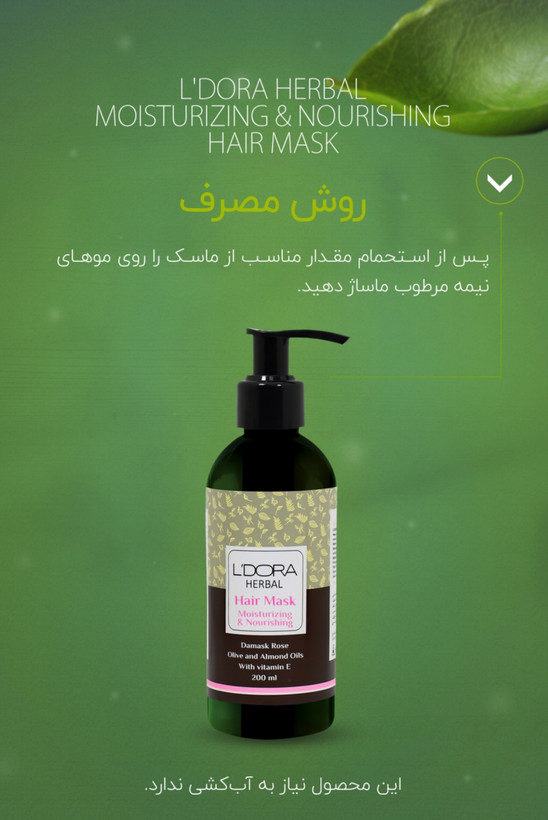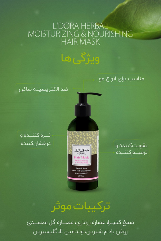 ماسک گیاهی نرمکننده و تقویتکننده موی سر لدورا هربال، محصولی بینظیر در مراقبت از مو به شمار میرود. ترکیب منحصر بهفرد موجود در این ماسک تأثیرات چندگانهای بر سلامت، نرمی، درخشندگی، ترمیم و تقویت بافت مو دارد. این محصول حرفهای برای احیا و ترمیم انواع مو طراحی شده است. روغنهای طبیعی موجود در این محصول به همراه ویتامین E، باعث تقویت، نرمی، درخشش و خوشحالتی مو میشود